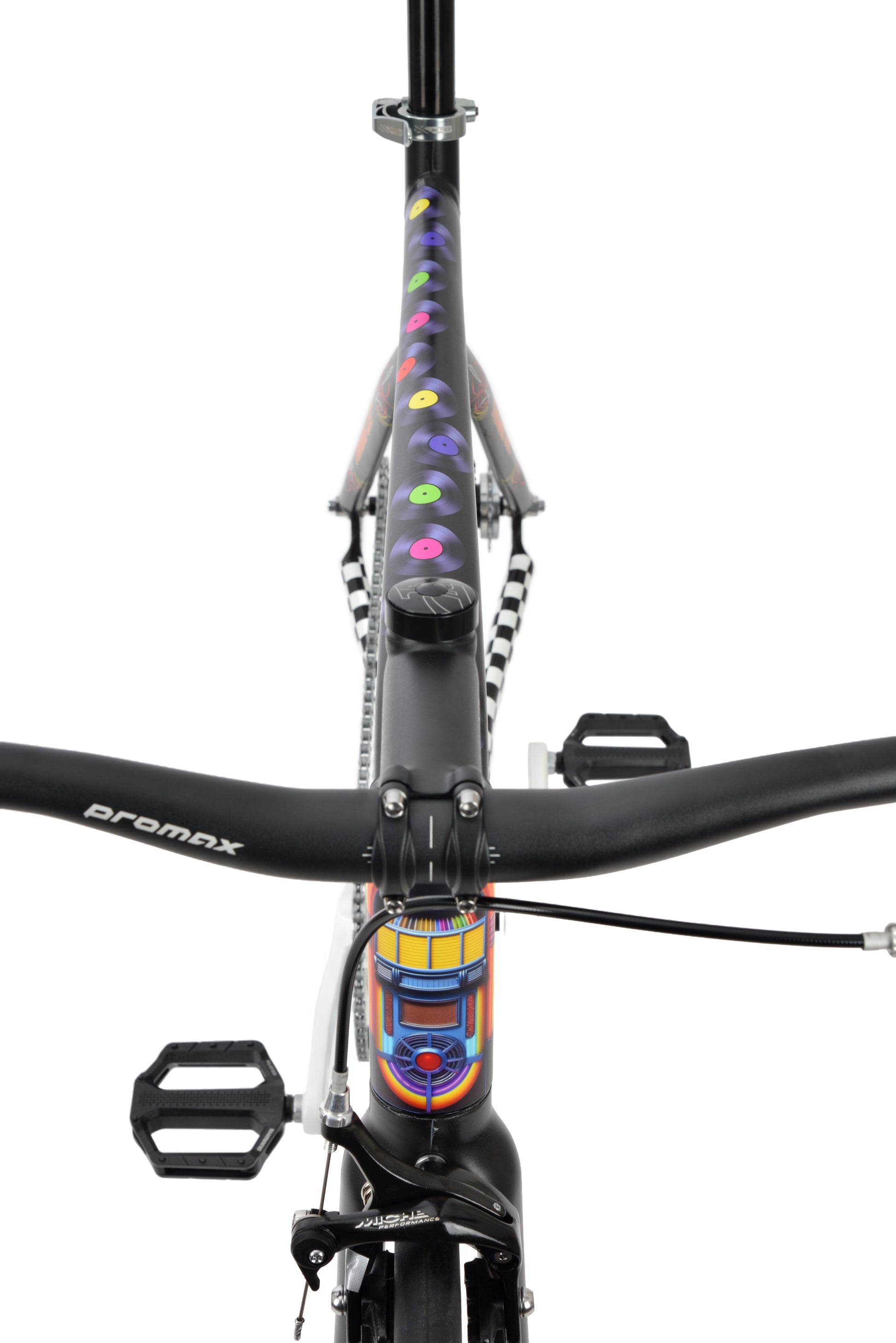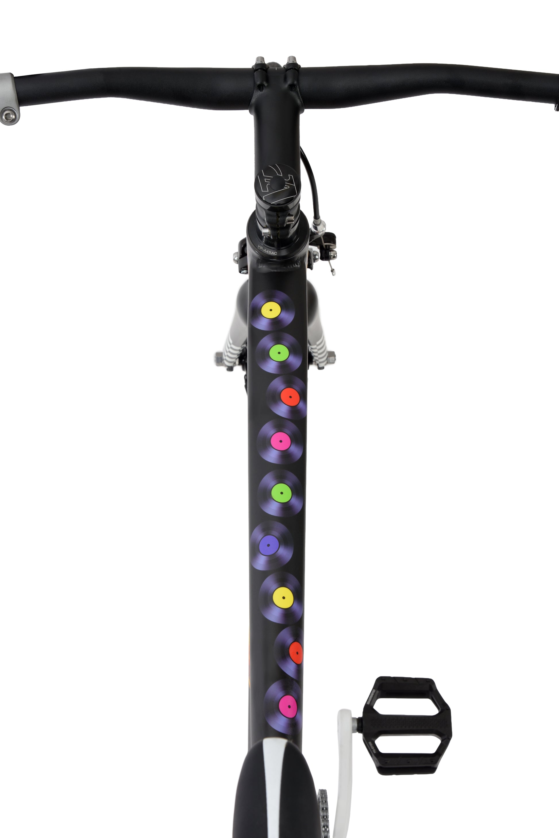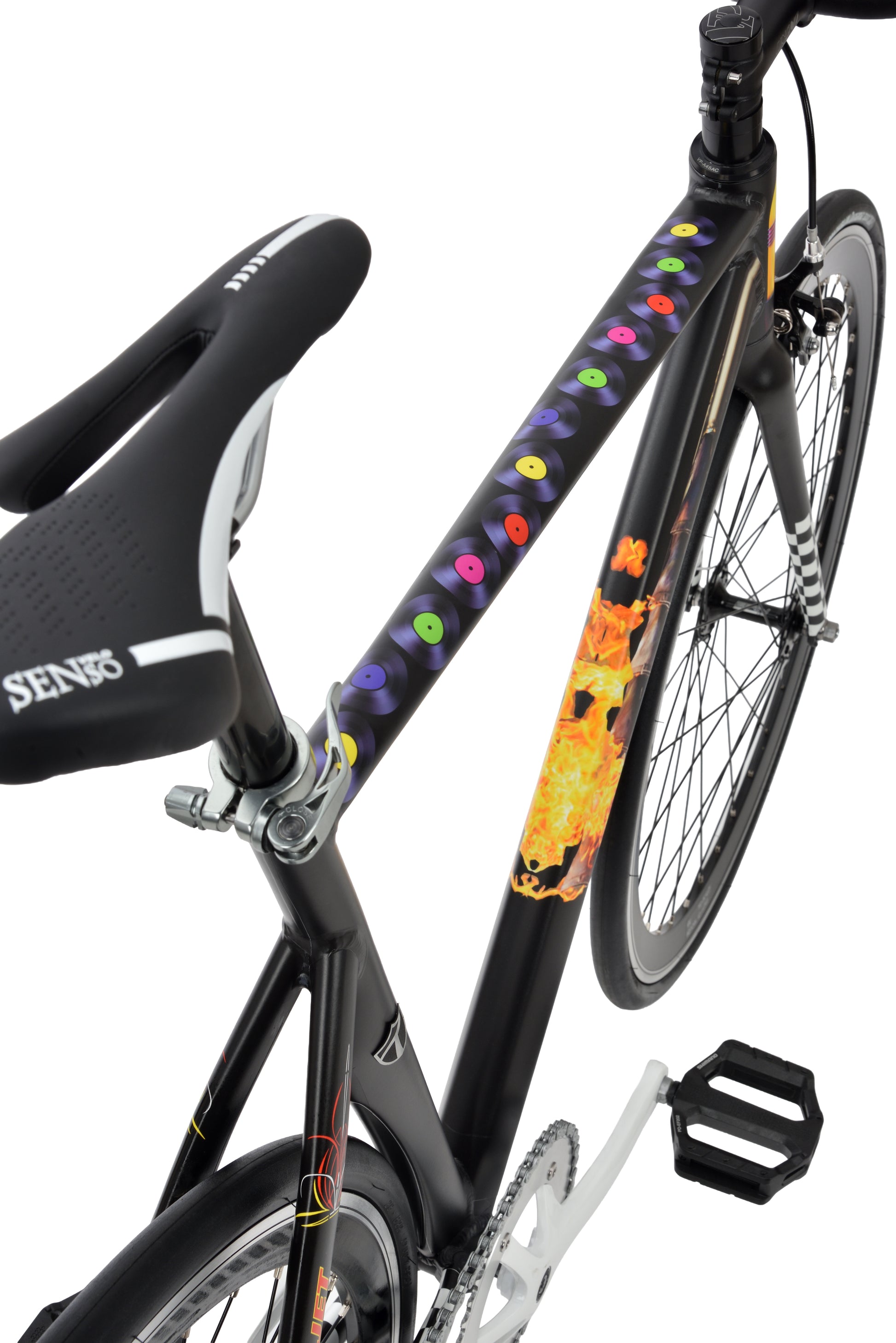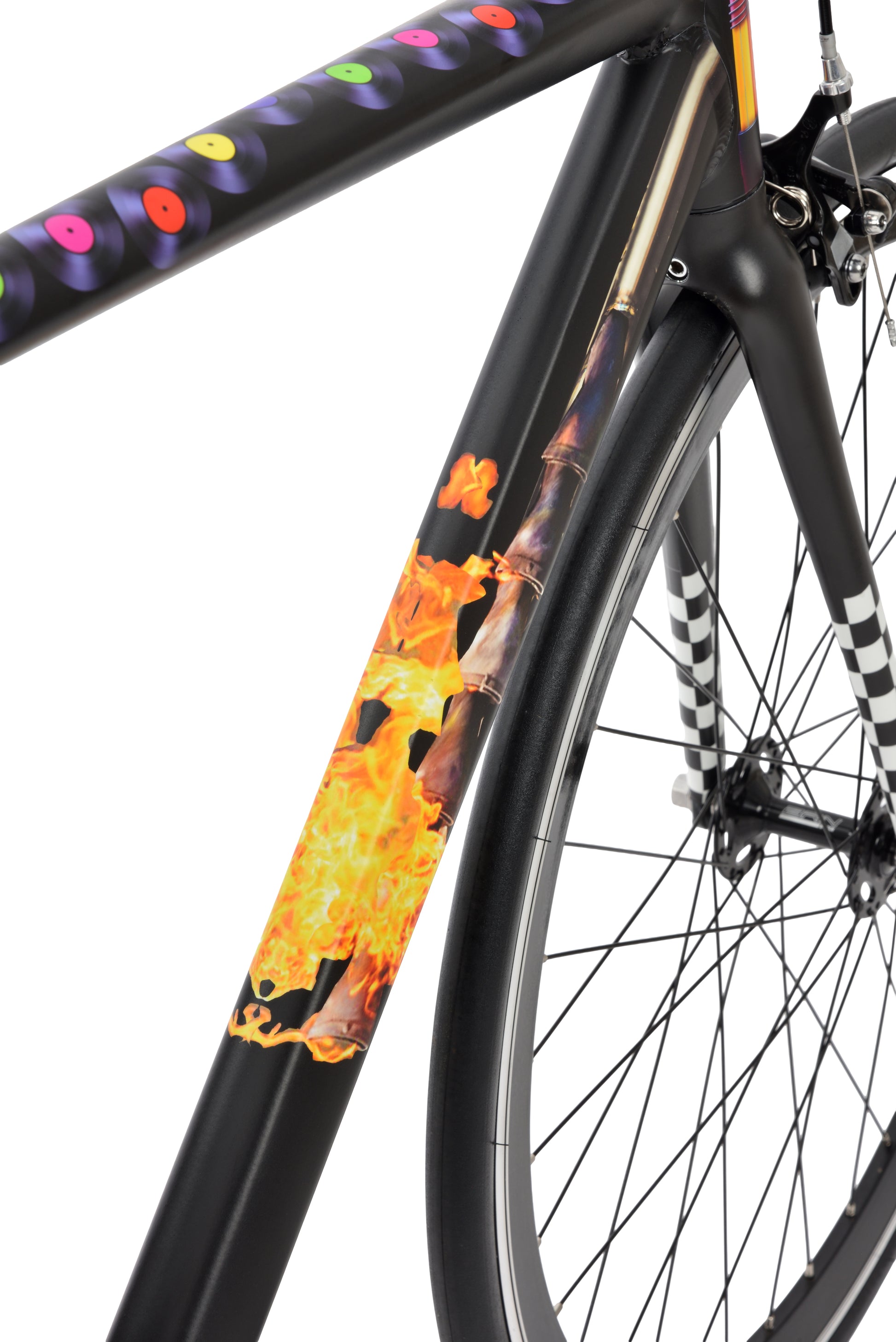 Sul tubo orizzontale del telaio, a partire proprio dalla congiunzione col tubo sella e quindi dal ciclista stesso, è possibile osservare una scia di vinili colorati: nella nostra visione, è l'energia del ciclista a produrre questo irripetibile carburante sonoro, che si propaga rapidamente sul corpo della bici.