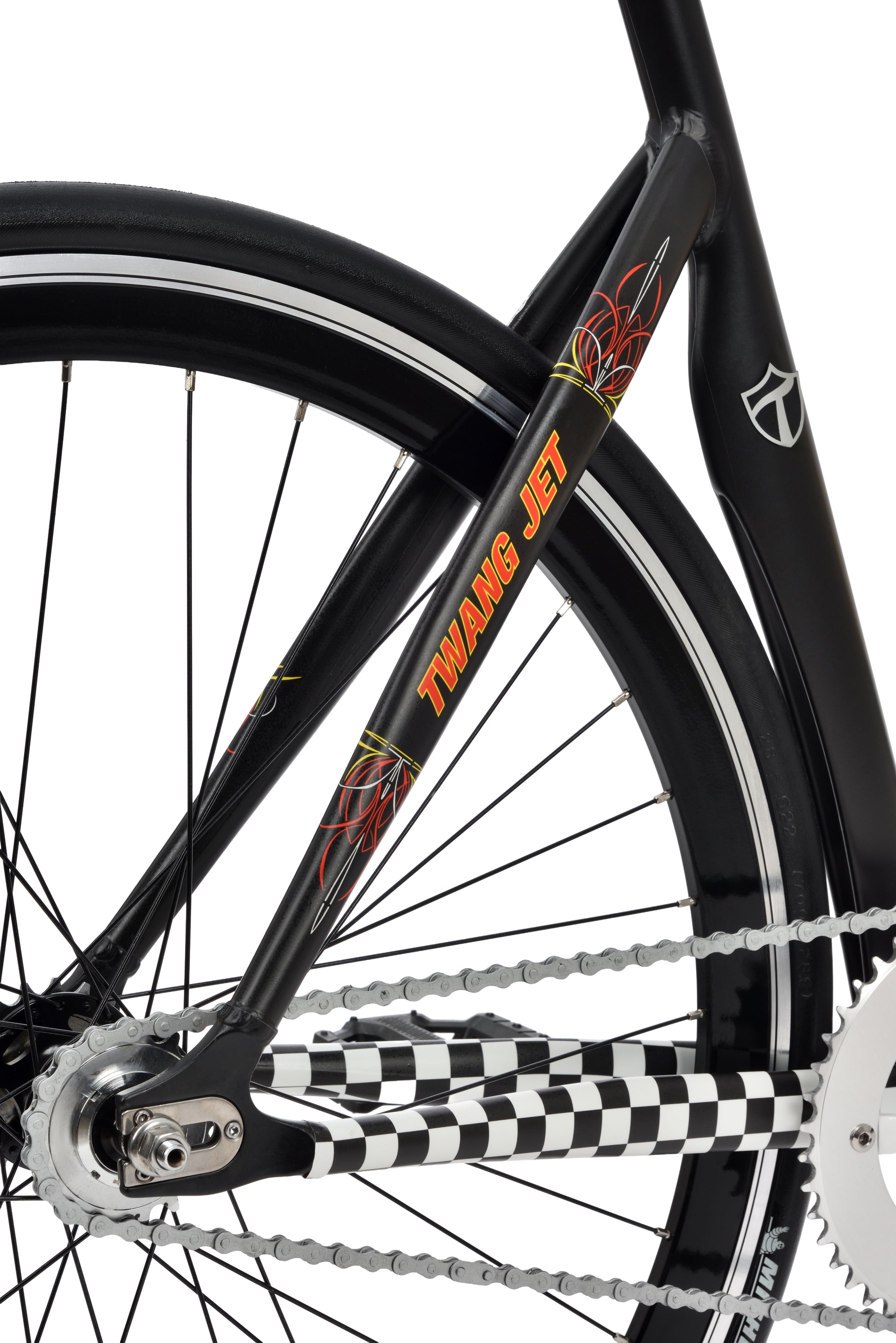 Ci è piaciuta, infine, l'idea che il Jukebox/motore richiamasse il potente immaginario delle hot rod cars di quegli anni: due turbine infuocate, poste sul tubo obliquo, a generare la potenza di fuoco da trasmettere al movimento centrale, ad irrorare tutta la bicicletta di quella forza cinetica ma anche musicale che solo coloro che si sentono pronti per la EM 116 S - Twang Jet possono pensare di sprigionare!